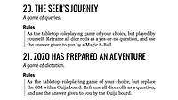 I've added two small games that I recently sketched out on twitter . These are "The Seer's Journey" and "Zozo Has Prepared an Adventure." I... think this update also includes some pandemic-inspired va...